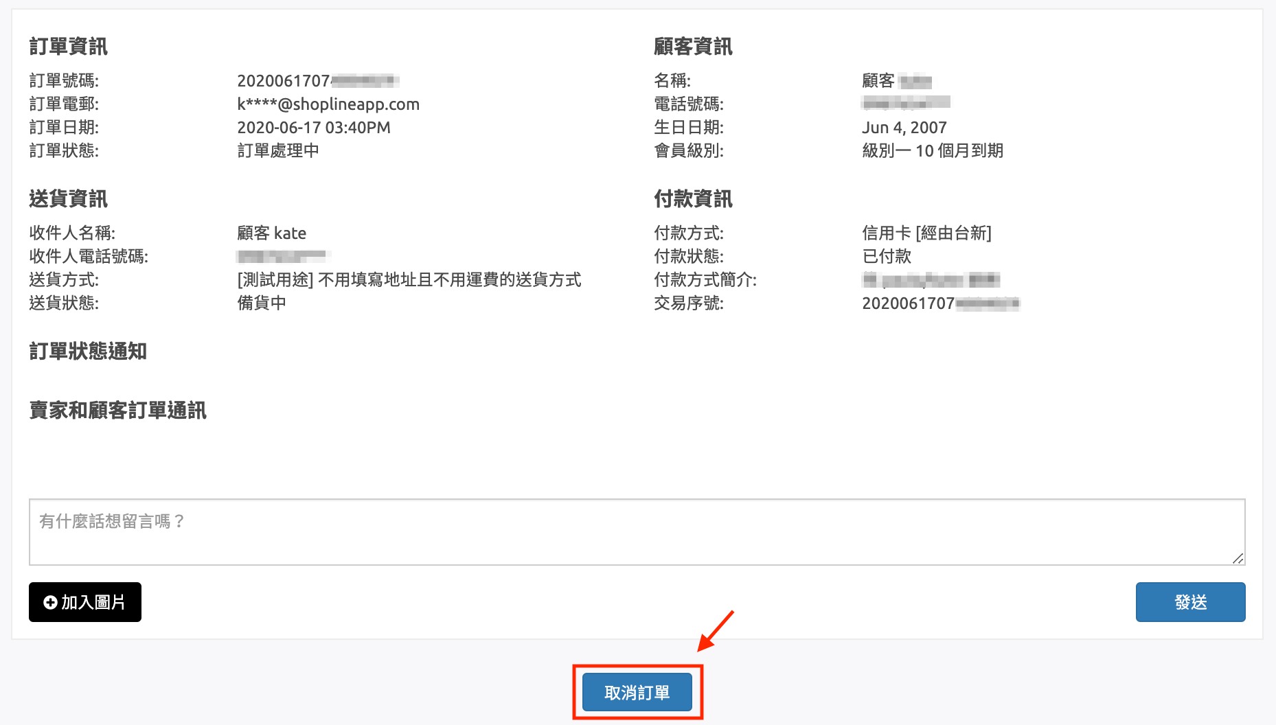若顧客填完取消原因,點按「取消訂單」時訂單狀態已變更(訂單狀態不再符合可被取消的條件,例如送貨狀態已改為「發貨中」) ,則顧客取消訂單將會失敗。