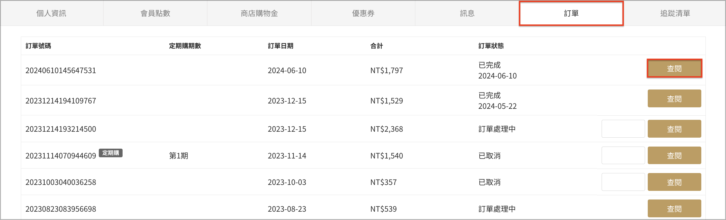 1.登入商店會員後,前往「會員中心 > 訂單」,在欲申請退貨的訂單旁點選「查閱」。