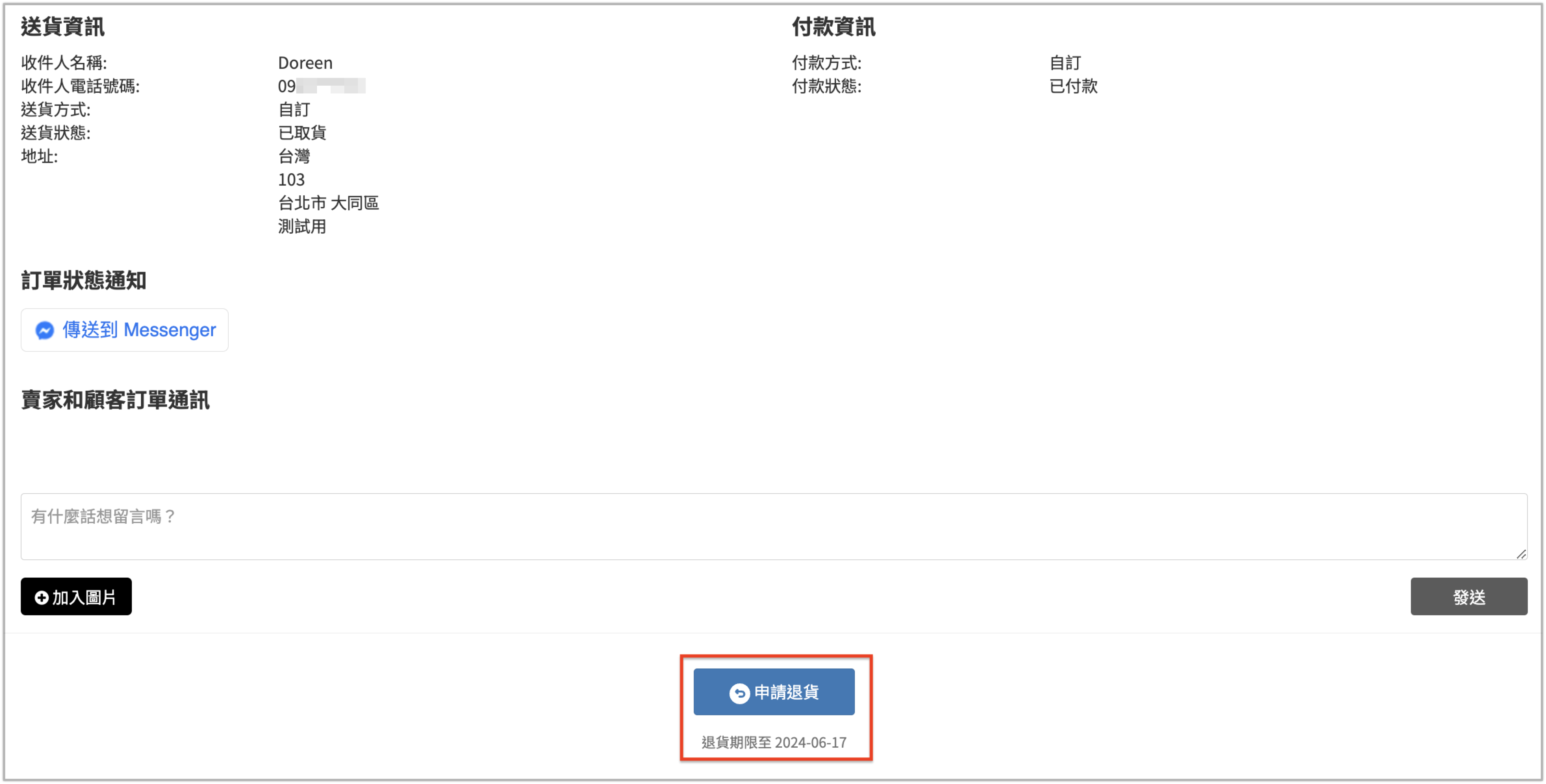 2.將頁面下滑至最底部,點選「申請退貨」。
