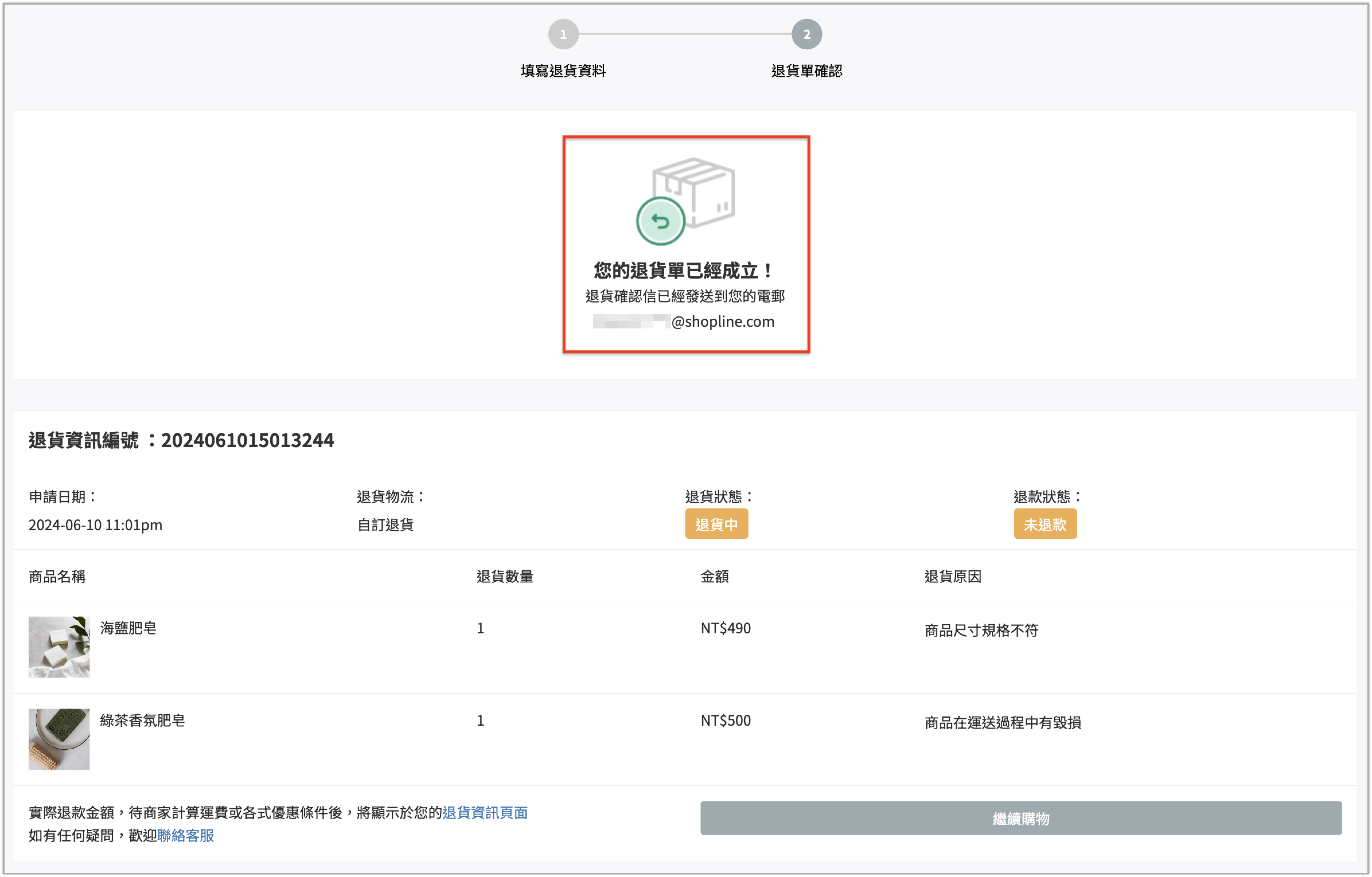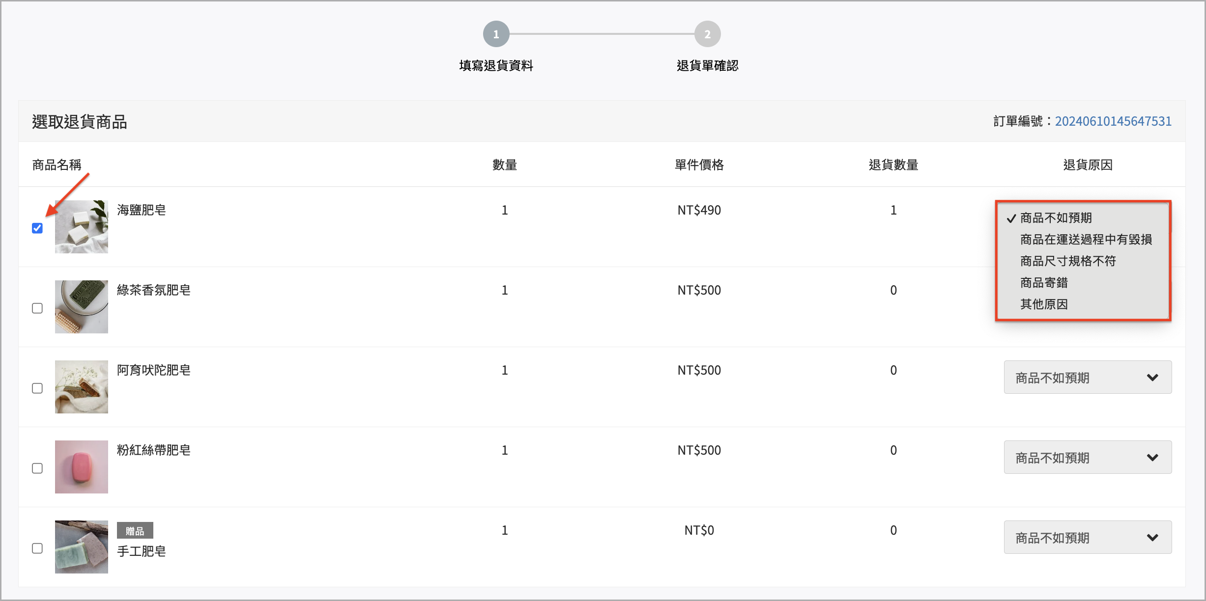 3.先選擇欲退貨的商品,再輸入退貨數量及退貨原因。