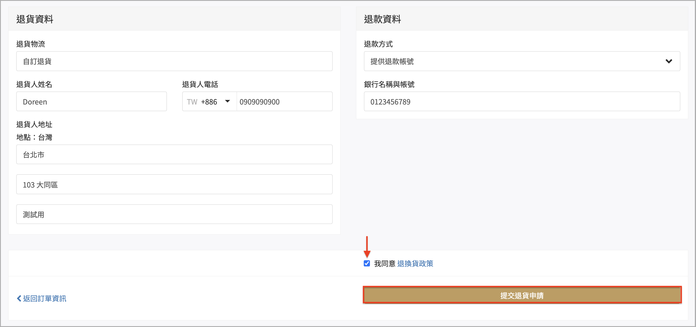 4.填寫退貨 / 退款資料,並勾選「我同意退換貨政策」後,點選「提交退貨申請」。